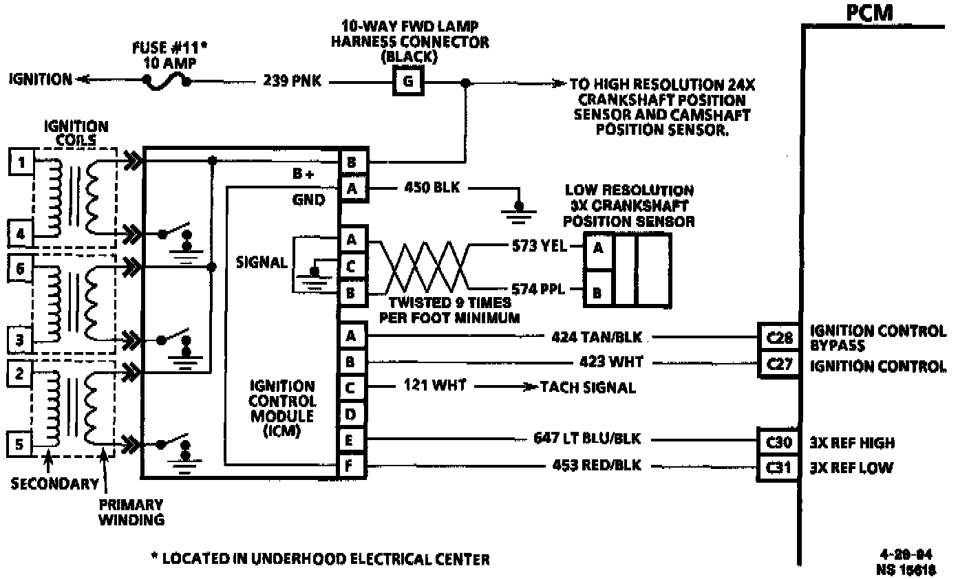 The IC system consists of the ignition coil and module assembly (ignition coils, electronic ignition control module), the 3X crankshaft position sensor and the 24X crankshaft position sensor, PCM and connecting wires. The Ignition Control Module (ICM) connector terminals are lettered as shown in the image. These circuits perform the following functions: