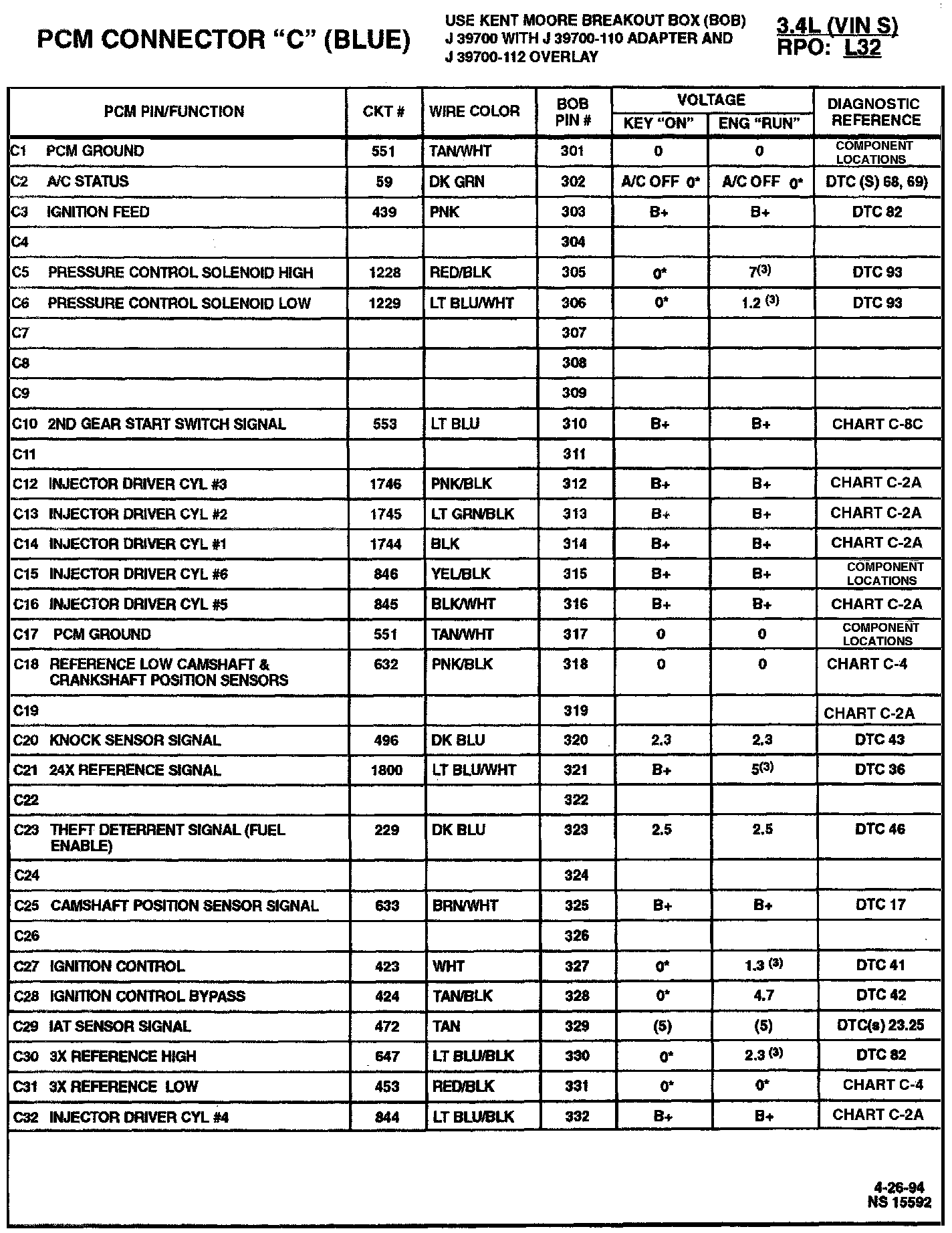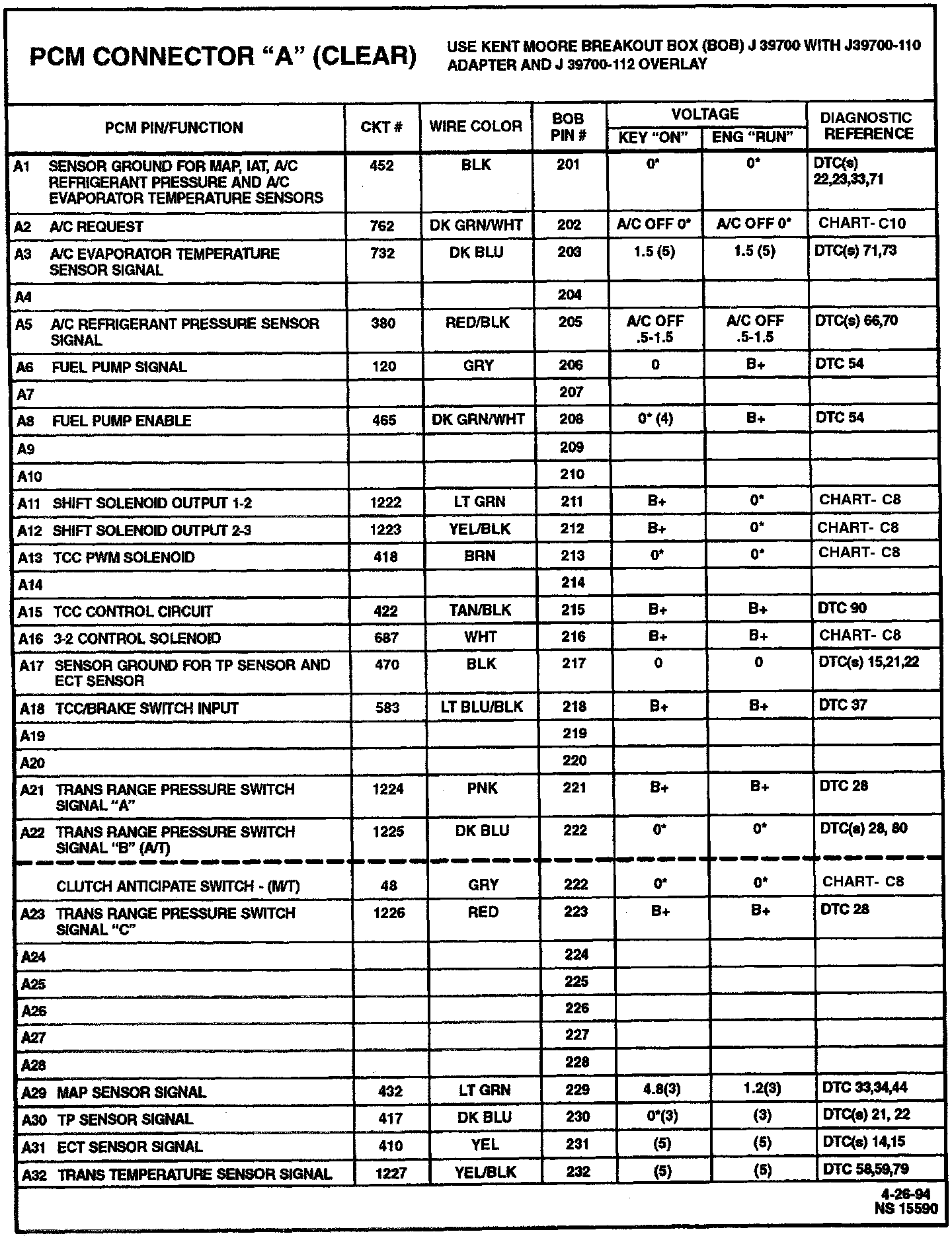 Install the Break-out Box (BOB) between the PCM harness connectors and the PCM, then probe the pin listed under "BOB PIN #." Voltage may vary due to low battery charge or other reasons, but should be close. All voltages shown in the ENG "RUN" column are typical with engine at idle, closed throttle, normal operating temperature, park or neutral, system in "Closed Loop," all accessories "OFF," and scan tool NOT installed.