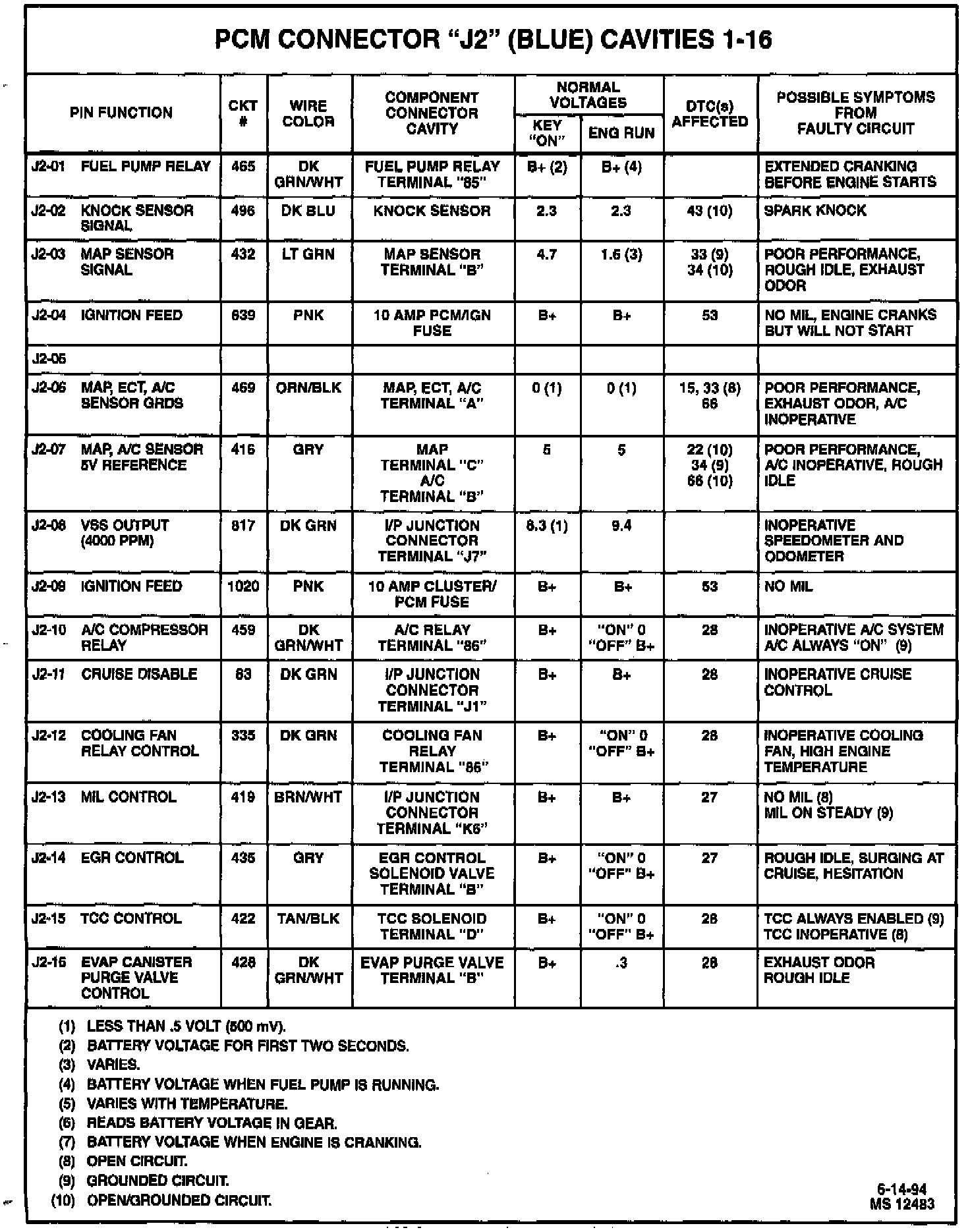 PCM Symptom Chart "j2" 1-16:
