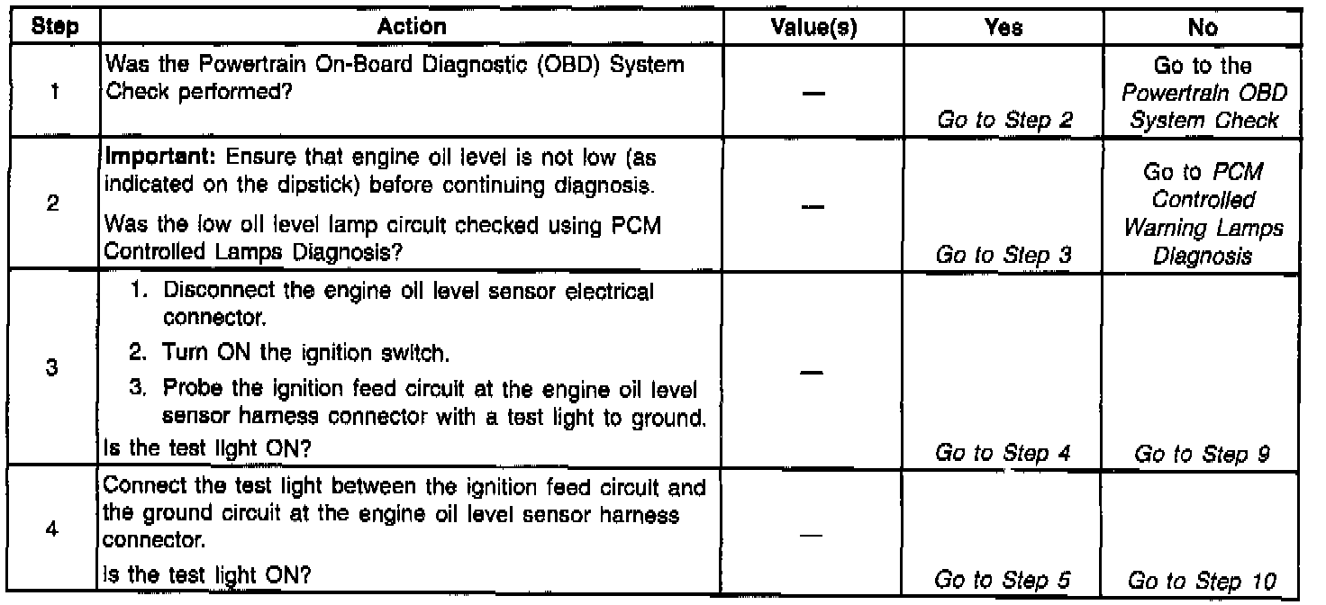 The oil level is determined by an optical sensor which detects oil level immediately upon powerup. While the engine oil level sensor is determining oil level, the sensor holds the state of the engine oil level signal at ignition voltage. The amount of time the engine oil level sensor requires to determine oil level is about 1.5 seconds. After the engine oil level has been determined, the engine oil level sensor will ground the engine oil level signal for 1 to 2 seconds if oil level is OK or 6 to 10 seconds if oil level is low. The PCM determines oil level based on the engine oil level signal duration. The PCM also monitors the engine oil level signal to determine whether the engine oil level PCM input circuit is open or shorted.