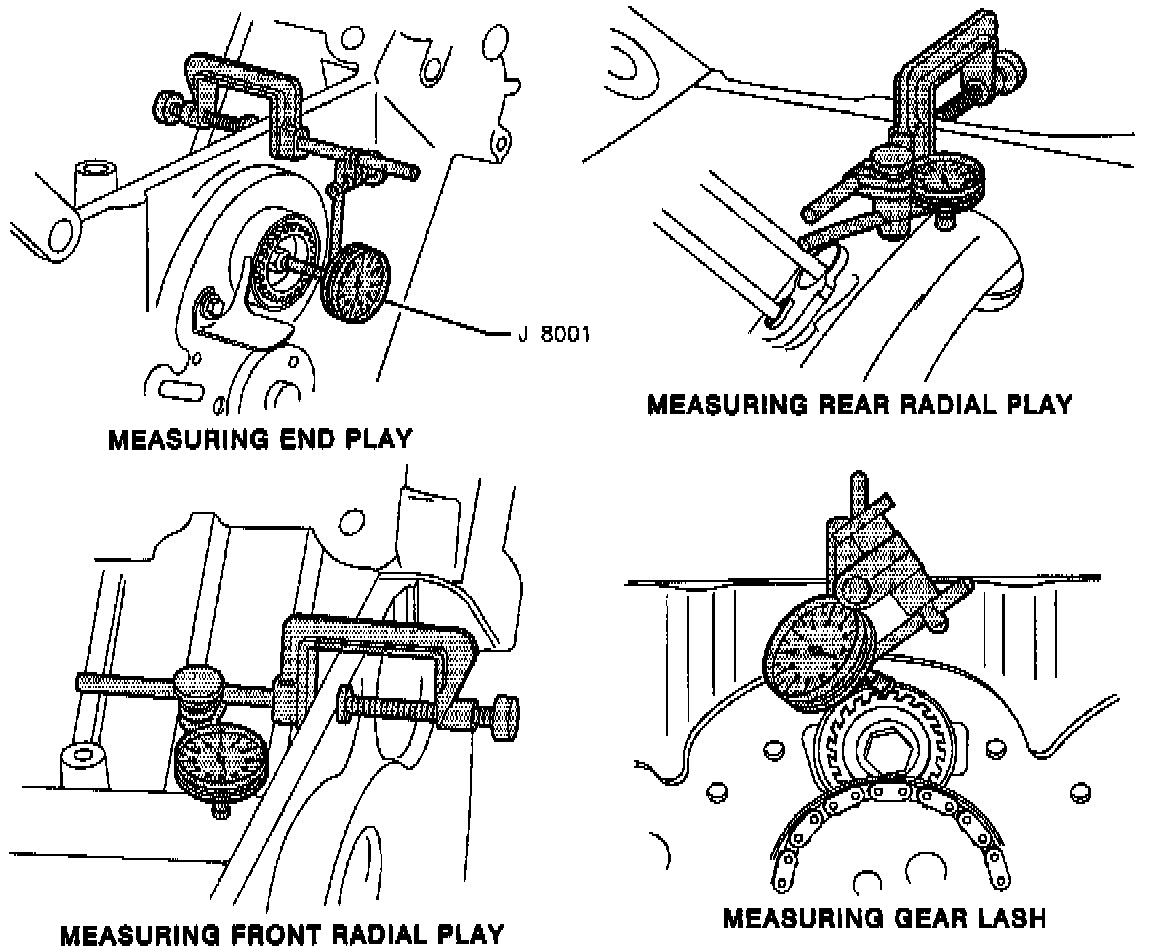 7. Inspect balance shaft end play and radial play at both front and rear. End play should be 0.0-0.008 inches, front radial play should be 0.0-0.0011 inches and rear play should be 0.0005-0.0047 inches.