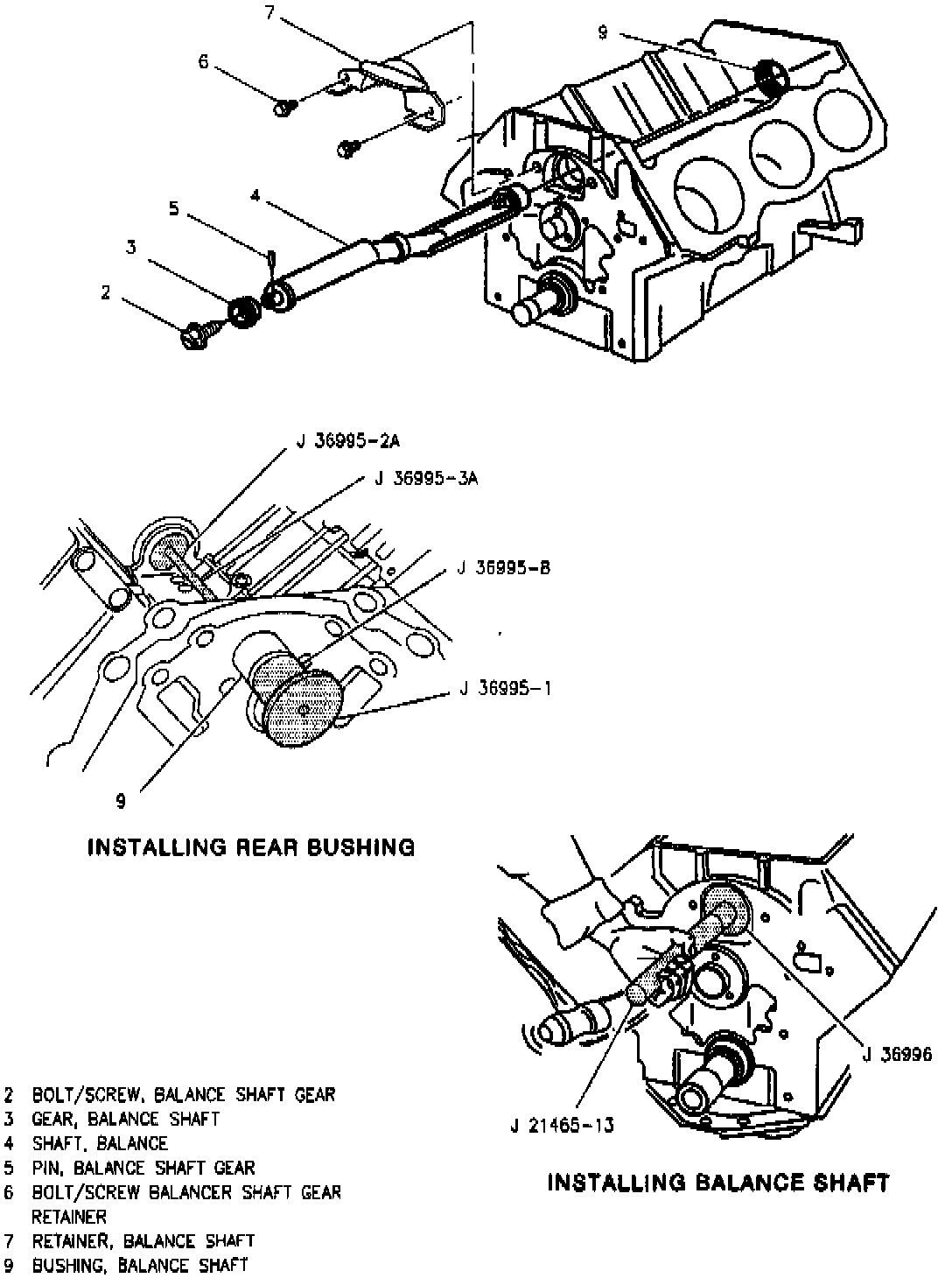 7. Remove balance shaft rear bushing using balance shaft remover tool Nos. J 36995-5, J 36995-3A and J 36995-2A, or equivalents.