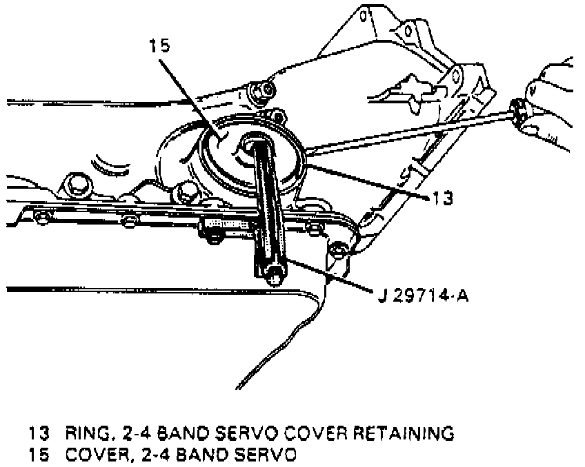 4. Install servo cover depressor tool No. J-29714-A or equivalent on oil pan and install bolt included with tool, Fig. 17.