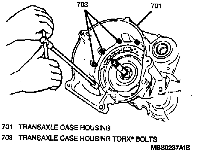 1. All internal and external transaxle case housing-to-transaxle case bolts. Note the position of the three Torx (R) head bolts.