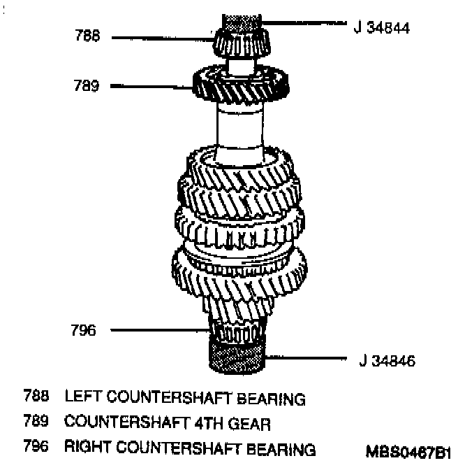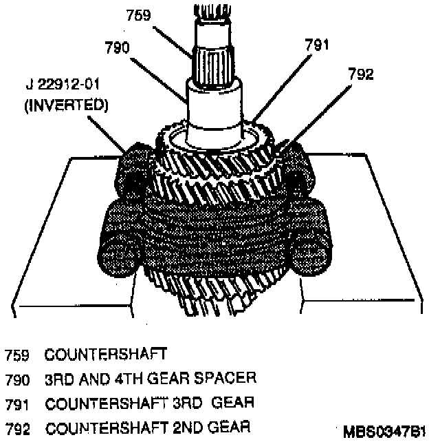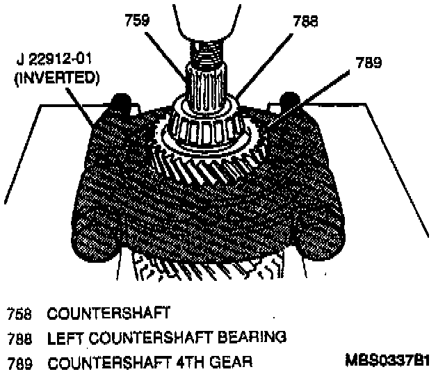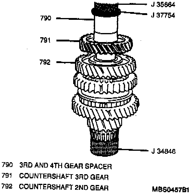 2. 3rd and 4th gear spacer with countershaft 3rd gear and countershaft 2nd gear from the countershaft using the J 22912-01 and a press arbor.