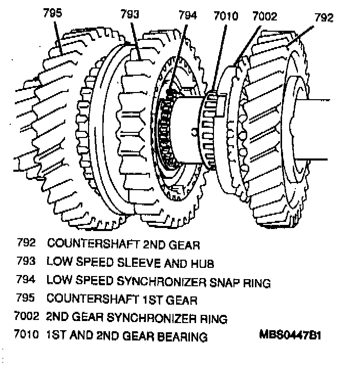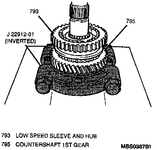 - Countershaft 1st gear for smooth rotation after low speed sleeve and hub installation. If countershaft 1st gear does not rotate smoothly, remove gear and reinstall it until smooth rotation is obtained.