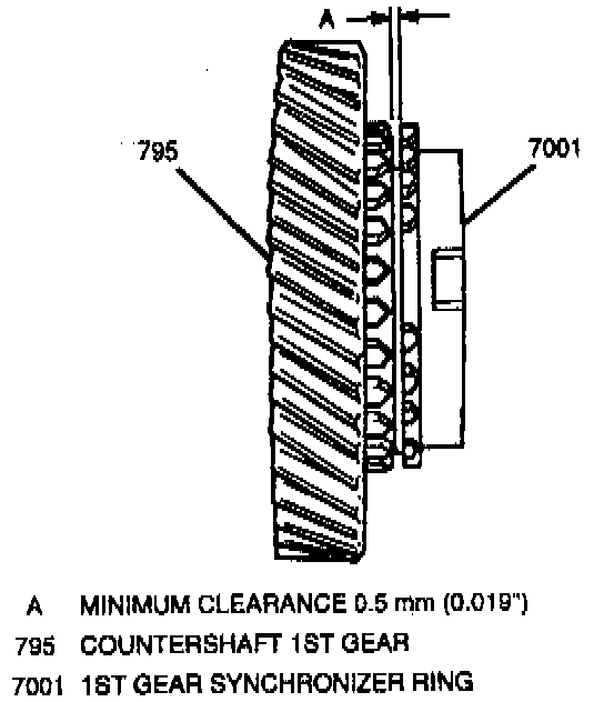 1. Clearance between the 1st gear synchronizer ring and countershaft 1 st gear using a feeler gage. Standard clearance is 1.0 to 1.4 mm (0.039 to 0.055 inch). If clearance is below 0.5 mm (0.019 inch), replace the 1 st gear synchronizer ring and countershaft 1st gear.