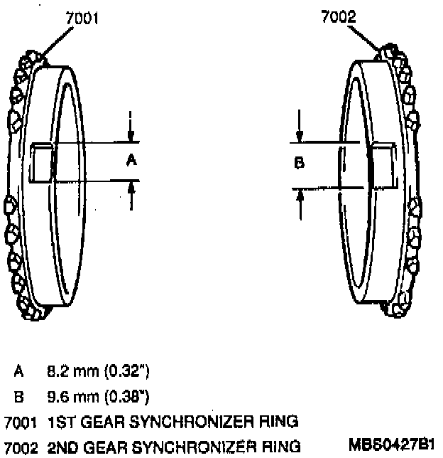 - The key slot width of the 1st gear synchronizer ring is smaller than that of the 2nd gear synchronizer ring. The difference in key slot width must be distinguished for correct countershaft assembly. If these synchronizer rings are transposed during countershaft assembly, shift failure may occur.