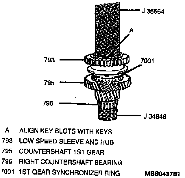 6. Countershaft 1st gear, 1st gear synchronizer ring and low speed sleeve and hub onto countershaft using the J 34846 for support, a J 35664 and a press arbor.