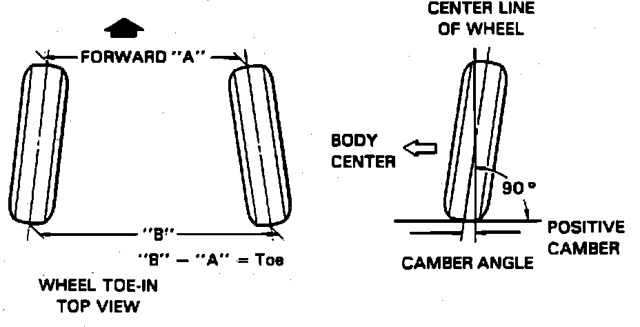 Wheel alignment is the angular relationship between the wheels, suspension attaching parts and ground. The angle of the knuckle away from the vertical, pointing in or out of wheels, tilt of the wheels from vertical (when viewed from front of vehicle) and tilt of suspension members from vertical (when viewed from side of vehicle), all of these are involved in proper alignment, Fig. 1.