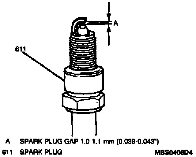 ^ Set spark plug gap to 1.0 to 1.1 mm (0.039 to 0.043 in.).
