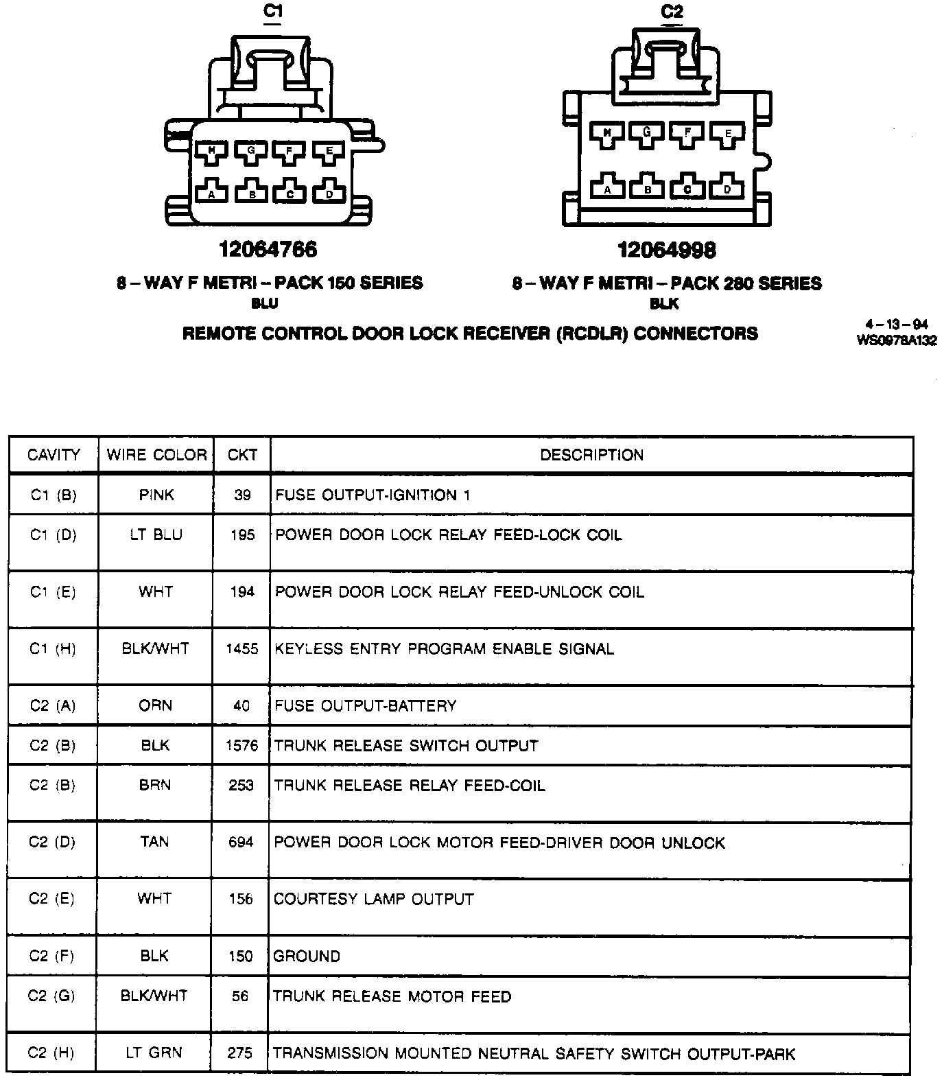 Remote Control Door Lock Receiver (RCDLR) Connectors: C1 & C2: