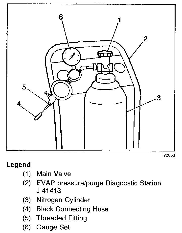 The enhanced EVAP service port is located in the evaporative purge hose located between the purge solenoid and the canister. The service port is identified by a green colored cap. The port contains a schrader valve and fittings to allow connection of J 41413 or equivalent evaporative pressure/purge diagnostic system.