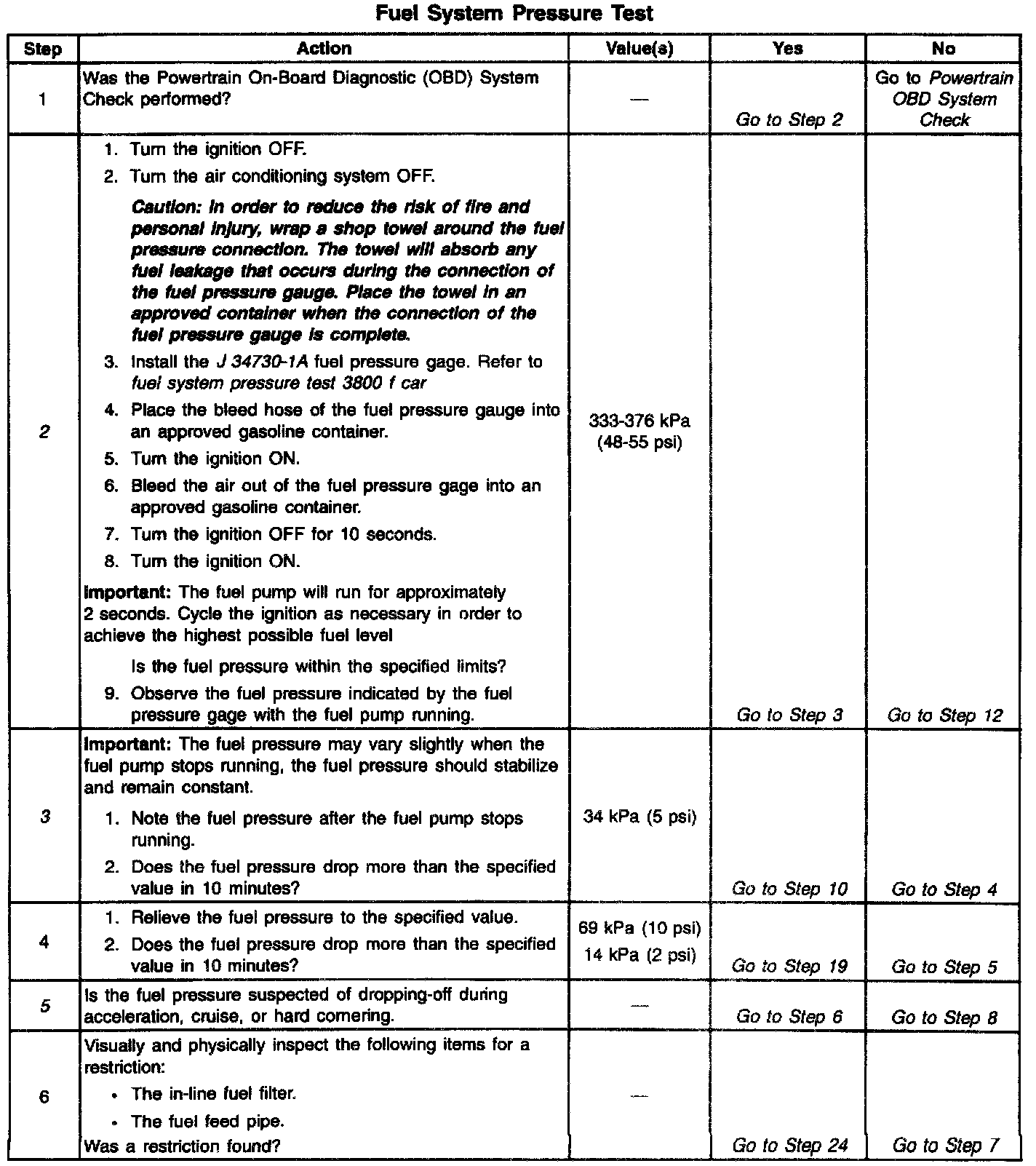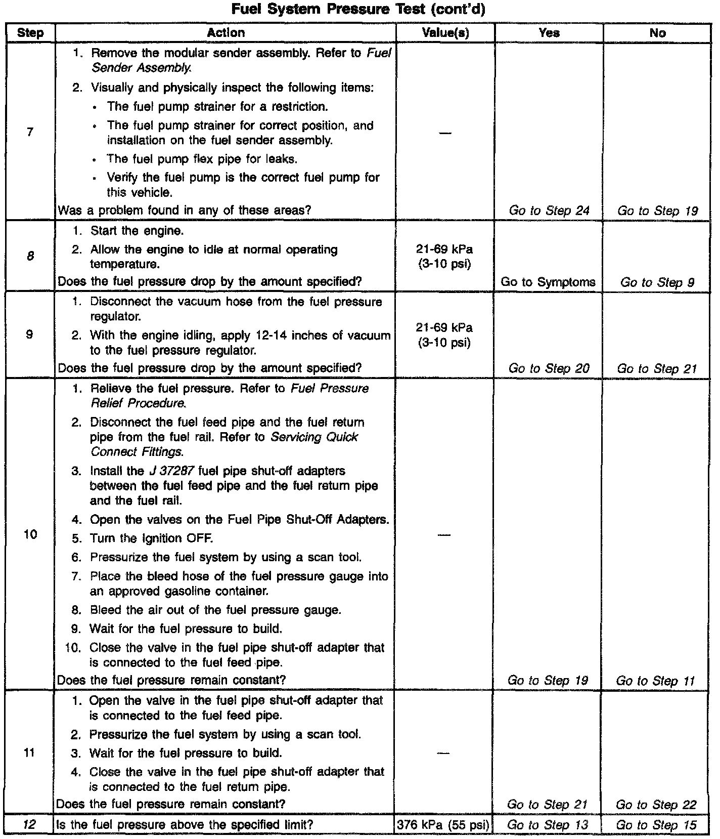 A fuel system pressure test is part of several of the diagnostic charts and symptom checks.