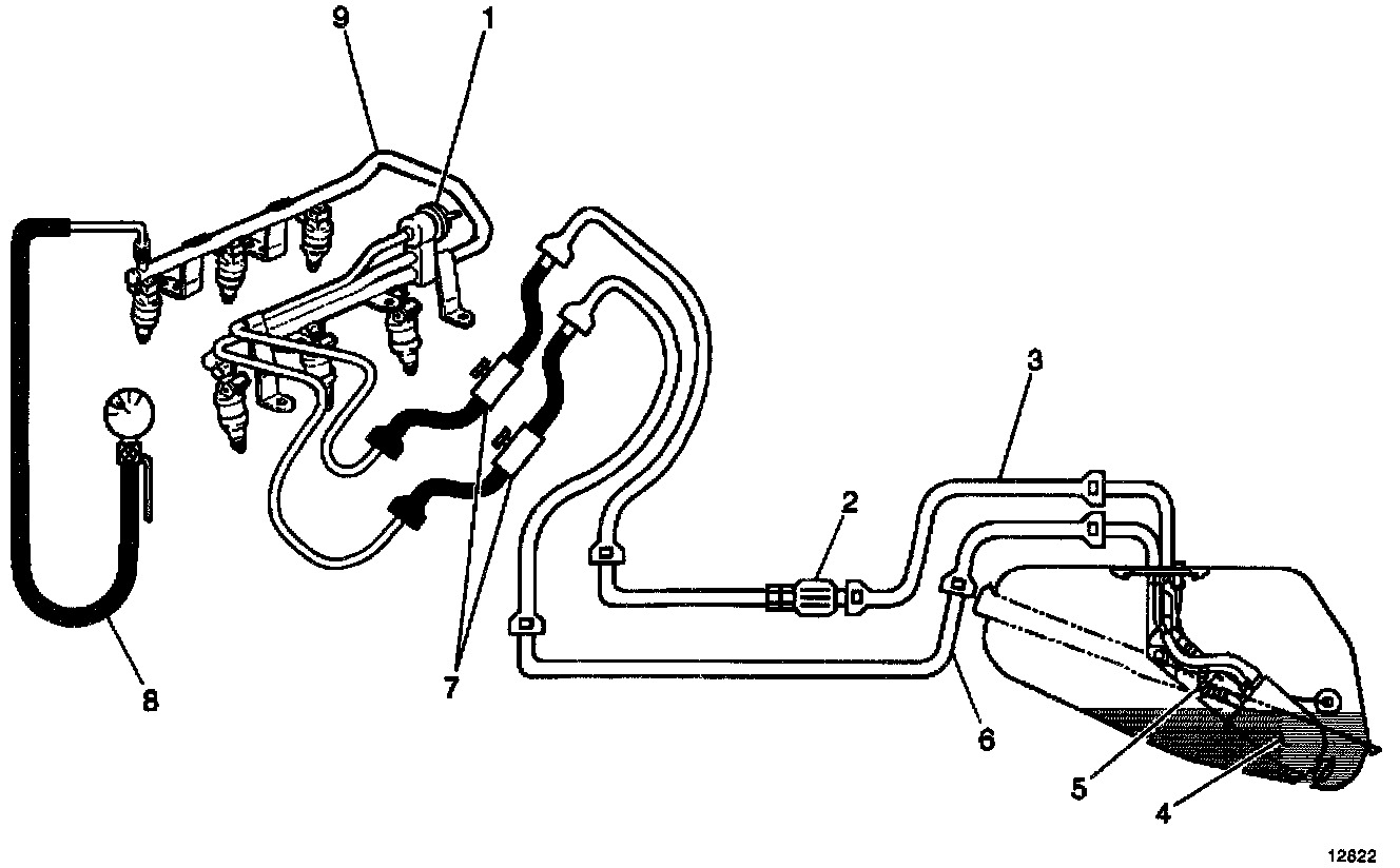 When the ignition switch is turned ON, the Powertrain Control Module (PCM) will turn ON the in-tank fuel pump. The in-tank fuel pump will remain ON as long as the engine is cranking or running and the PCM is receiving reference pulses. If there are no reference pulses, the PCM will turn the in-tank fuel pump OFF 2 seconds after the ignition switch is turned ON or 2 seconds after the engine stops running. The in-tank fuel pump is an electric pump within an integral reservoir (4). The in-tank fuel pump supplies fuel through the fuel feed pipe (3), and in-line fuel filter (2) to the Fuel Rail Assembly (9). The fuel pump is designed to provide fuel at a pressure above the pressure needed by the fuel injectors. A fuel pressure regulator (1), attached to the Fuel Rail, keeps the fuel available to the fuel injectors at a regulated pressure. Unused fuel is returned to the fuel tank by a separate fuel return pipe (6). The fuel pump flex pipe (5) functions as a conduit for transporting pressurized fuel from the fuel pump to the above cover fuel feed pipe. The fuel pump flex pipe also eliminates fuel pump generated pressure pulse noise, and eliminates clamps formerly needed for rubber hoses or nylon pipes. The fuel pressure gauge J 34730-1A (8) and fuel pipe shut off adapters J 37287 (7) are used for fuel system diagnosis.
