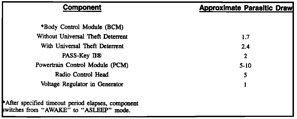 - If current draw is above specifications listed in component parasitic load chart, remove system fuses and mini-breakers one at a time until current draw returns to a value less than or equal to specifications listed. This should be done while monitoring the ammeter so that a disruption of drain will be evident. Refer to Figure above for approximate parasitic loads for various vehicle components. Set ammeter on maximum scale when pulling fuses to avoid damage.