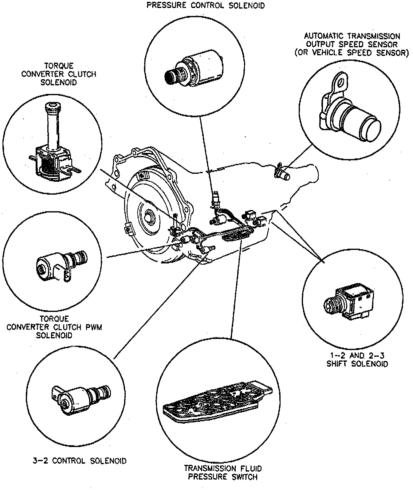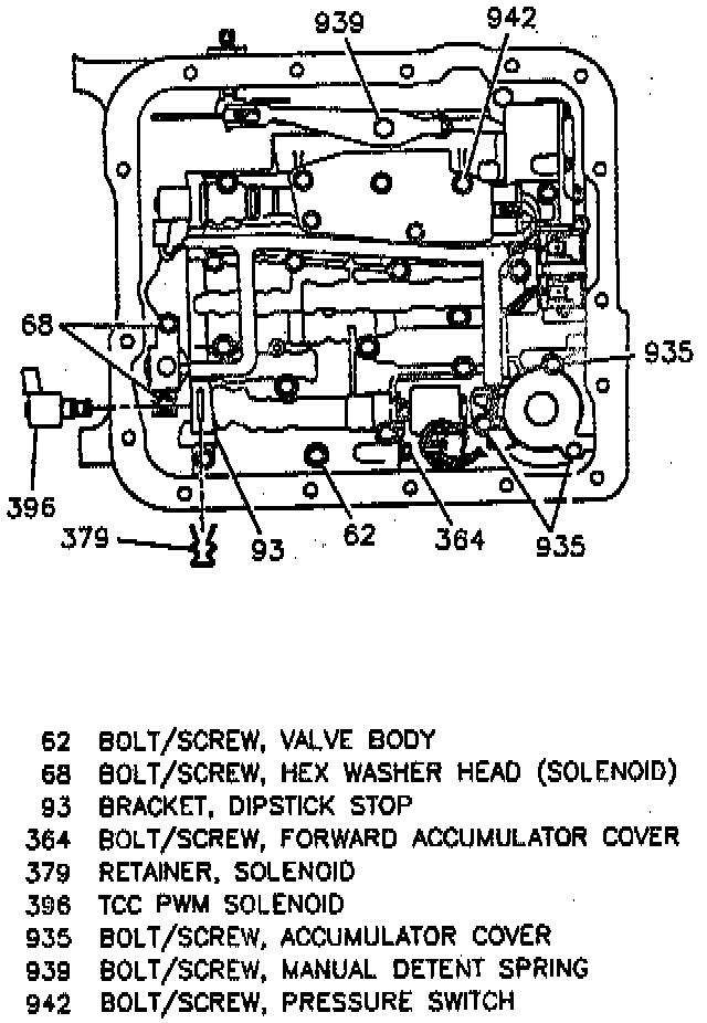 3. Torque converter clutch (TCC) solenoid bolts/screws and solenoid with O-ring seal.