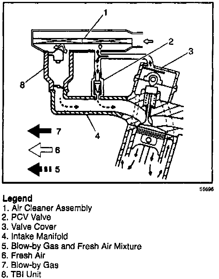 To maintain idle quality, the PCV valve restricts the flow of blow-by gas whenever intake manifold vacuum is high. When abnormally high crankcase (blow-by gas) pressure occurs, the system is designed to allow the excess quantity of blow-by gases to flow back through the crankcase vent tube into the air cleaner to be consumed by normal combustion.