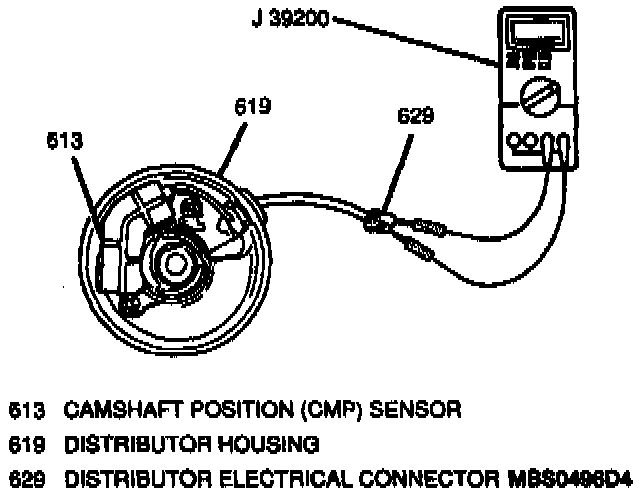 Using a J 39200 digital multimeter, measure resistance of the camshaft position (CMP) sensor between the two terminals of the distributor connector. If the resistance is not 205 to 255 ohms, the CMP sensor must be replaced.