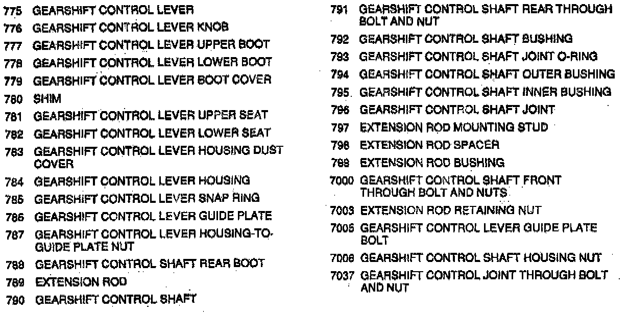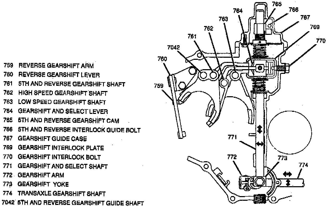 Gear selection is transmitted from the gearshift control lever, to the transaxle by means of a gearshift control shaft. The gearshift control shaft is connected to the transaxle gearshift shaft by the gearshift control shaft joint. When the transaxle gearshift shaft is moved in, out or turned, its movement is transmitted by means of an arm and yoke to the gearshift and select shaft assembly. The gearshift and select shaft assembly is responsible for actuating each shift shaft and fork for the desired transaxle gearshift. A gearshift interlock plate is provided to prevent two different gears from engaging during shifting.
