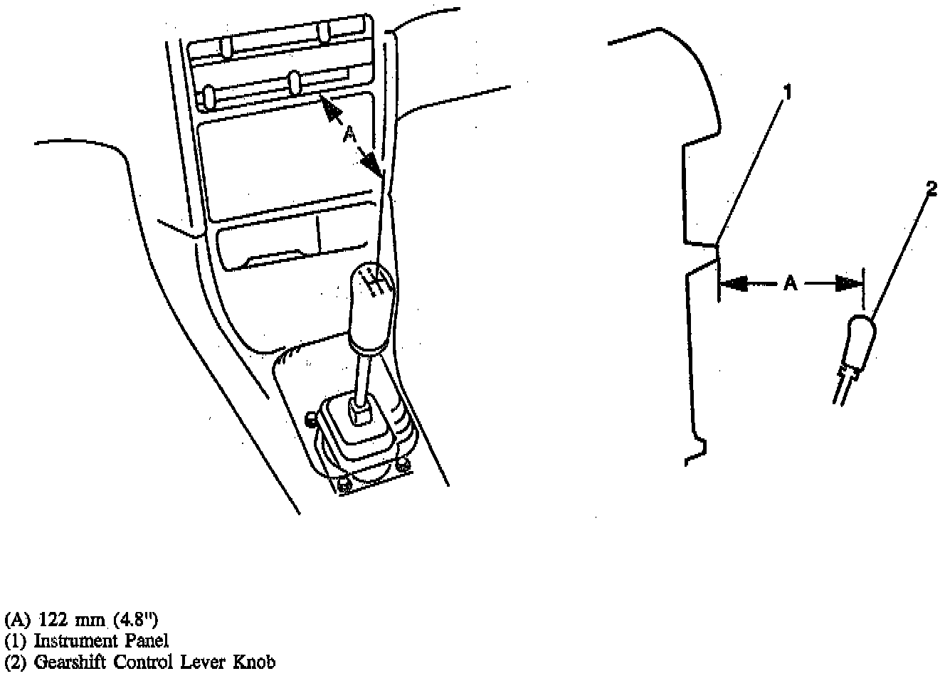 - Distance from gearshift control lever knob to instrument panel with the gearshift control lever in the neutral position. Distance should measure 122 mm (4.8 inch). If the gearshift control lever is not at the correct distance from the instrument panel, move the control lever forward or backward to obtain the proper distance.