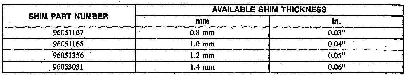 Gear Shift Lever Shim Table: