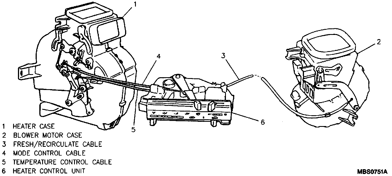 8. Temp, mode, and fresh/recirc control cables at heater case and blower case.
