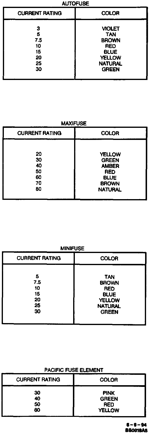 Fuses are color coded. The standardized color identification and ratings are shown. For service replacement, non-color coded fuses of the same respective current rating can be used.