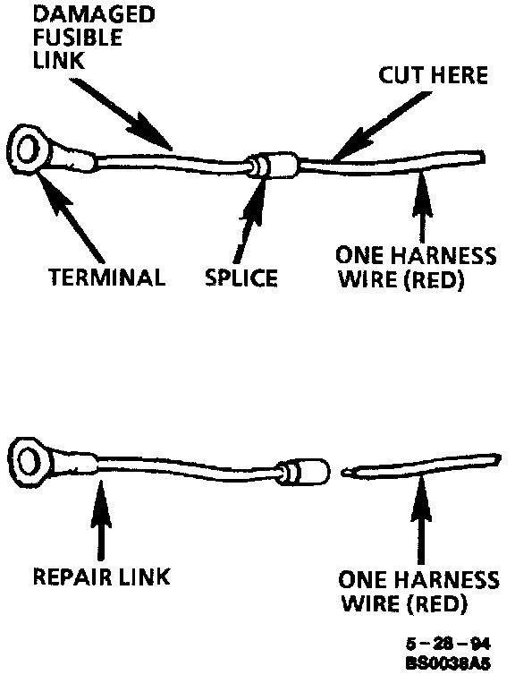 To replace a damaged fusible link which feeds two harness wires, cut them both off beyond the splice. Use two repair links, one spliced to each harness wire.