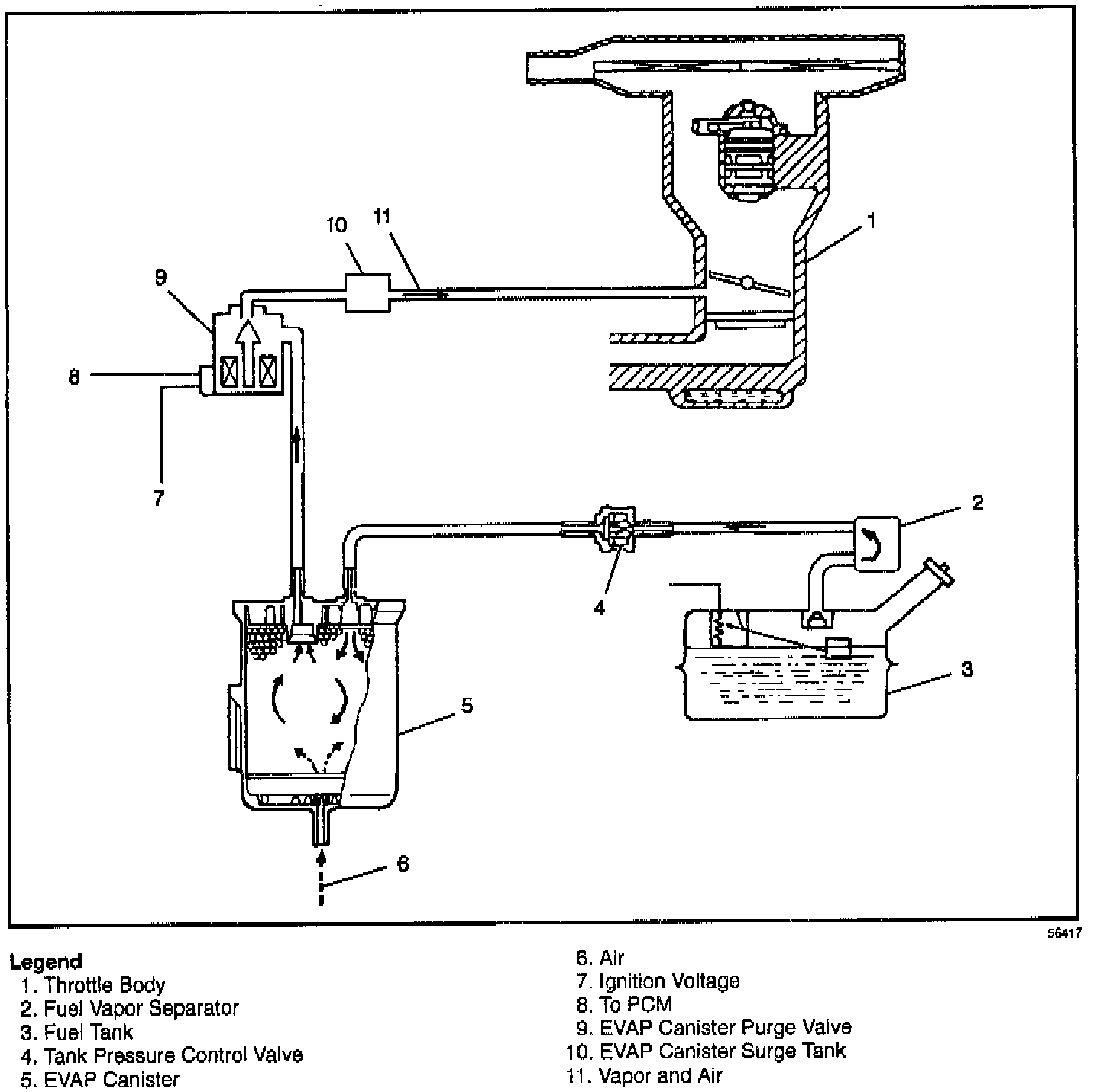 The basic Evaporative Emission (EVAP) control system used on all vehicles is the EVAP canister storage method. This method transfers fuel vapor from the fuel tank to an activated carbon (charcoal) storage device (EVAP canister) to hold the vapors when the vehicle is not operating. When the engine is running the fuel vapor is purged from the carbon element by intake air flow and consumed in the normal combustion process.