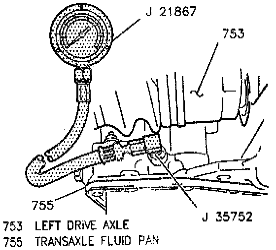 4. Install J 35752 into the line pressure tap at the rear of the transaxle.