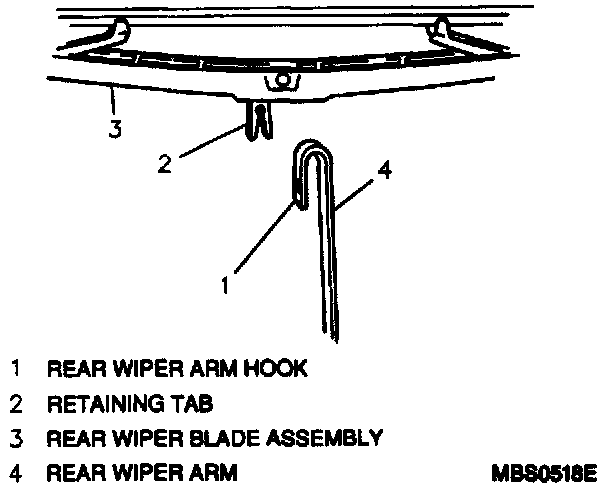 1. Depress retaining tab on rear wiper blade assembly, slide blade down rear wiper arm until it clears the wiper arm hook and then remove the blade assembly from the wiper arm.