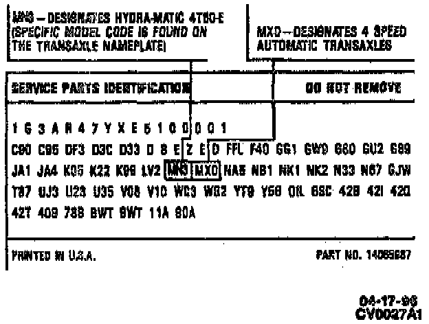 Additional transaxle identification is provided on the Service Parts Identification label. This label contains information on the regular production options (RPO) as well as standard and mandatory options, as shown.