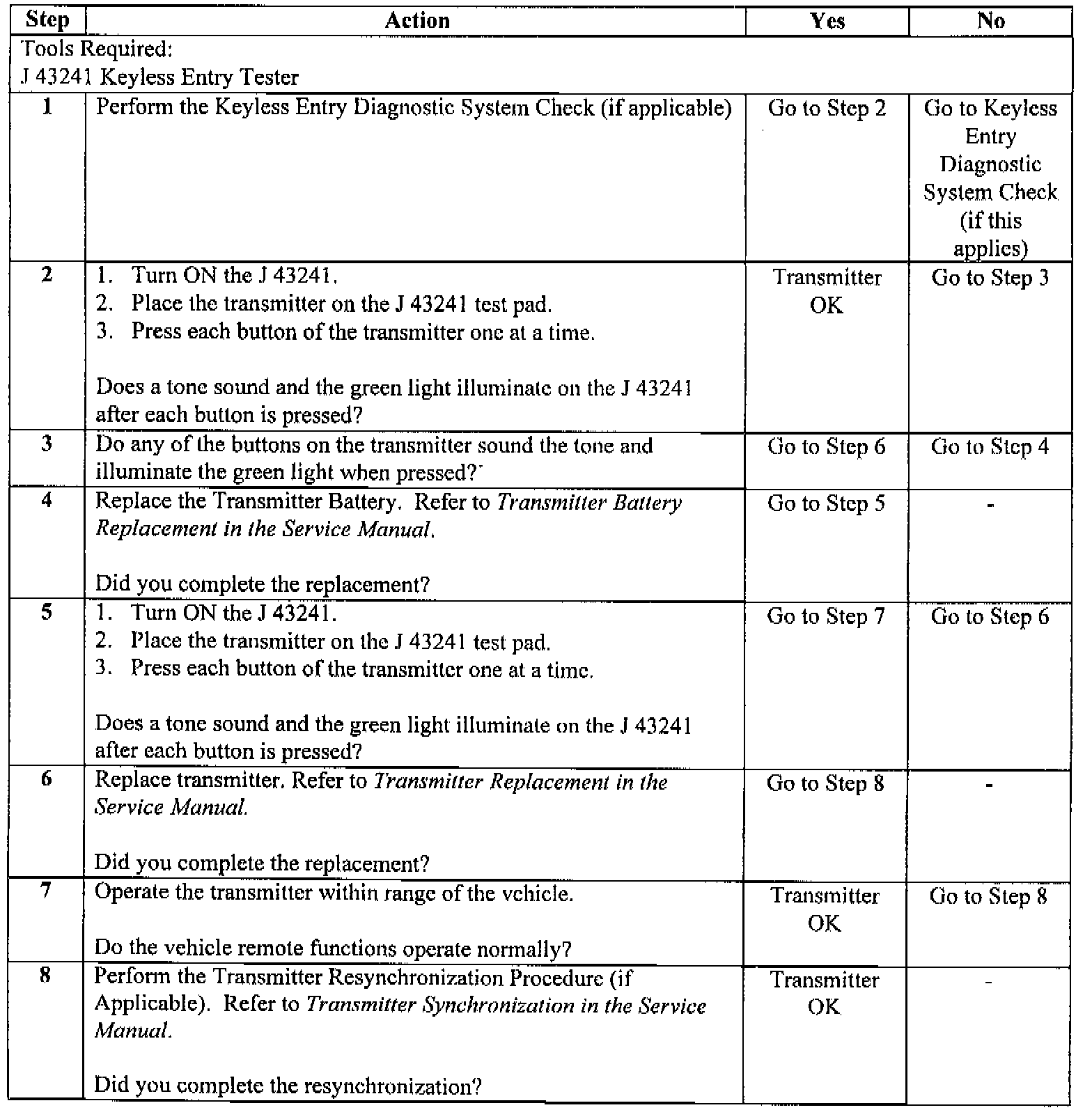 2. Ensure that the transmitter is synchronized with the vehicle (if applicable). Refer to Transmitter Synchronization in the appropriate Service Manual.