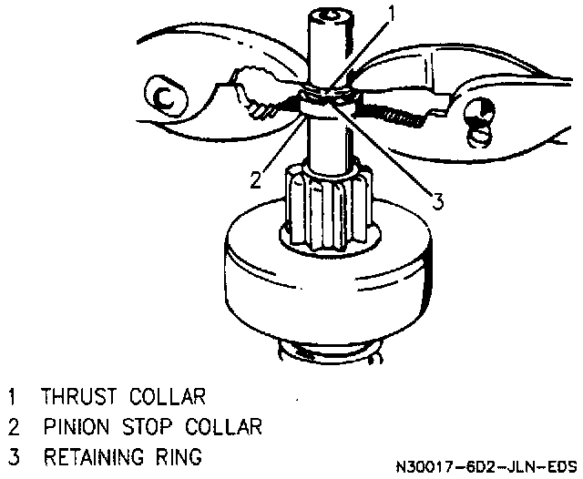 E. Thrust collar to end of shaft with flange toward retainer ring. Use pliers as shown to snap pinion stop collar over retainer ring.