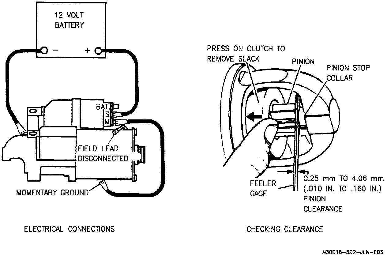 E. Press on drive just enough to take up any free movement of the pinion on the shaft. Use feeler gages to check clearance between end of pinion and pinion stop collar. Clearance should be 0.25 to 4.06 mm (0.010 inch to 0.160 inch).