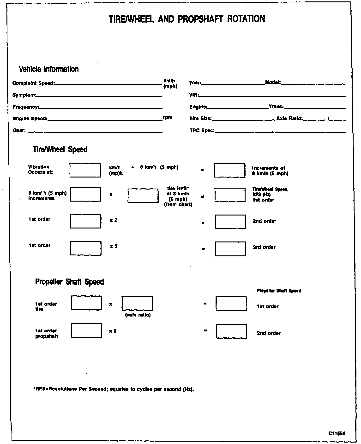 The previously released Tire/Wheel Rotational Worksheet or the Tire/Wheel and Propshaft Rotational Worksheet did not prompt the user to consistently input a standard and/or metric value on the worksheet. This could lead the user to an incorrect diagnosis of a vibration. The included revised worksheet is applicable to front, rear, and four-wheel drive vehicles as it includes the formula for calculating propshaft speed.