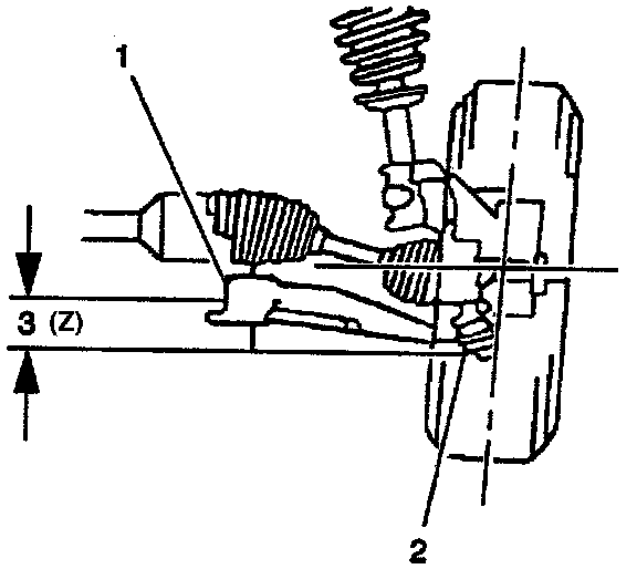 8. Measure the clearance (3) between the centerline of the rear bolt bushing (1) and the lowest point on the ball joint housing (2) (except the grease fitting). The clearance (3) should measure 50-70 mm (1 15/16-2 3/4 in) on the LSS, Eighty-Eight, Lesabre, and Bonneville.