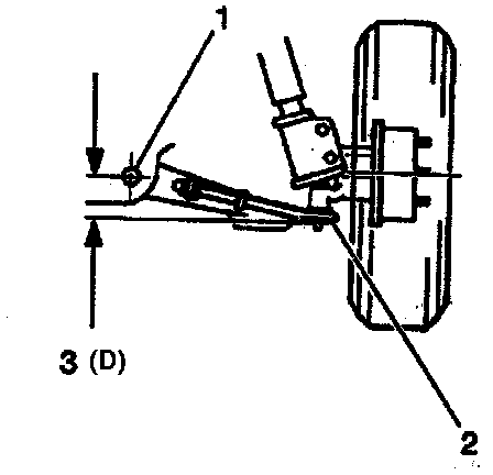 9. Measure the clearance (3) between the centerline of the rear bolt bushing (1) and the lowest point on the ball joint housing (2) (except the grease fitting). The clearance (3) should measure 68-88 mm (2 11/16-3 7/16 in) on the LSS, Eighty-Eight, Lesabre, and Bonneville.