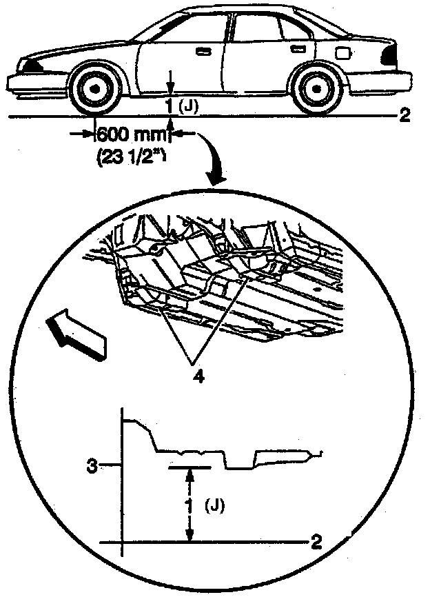 10. Measure the clearance (1) between the front underbody (4) and the ground (2). The clearance (1) should measure 229-249 mm (9-9 13/16 in) on the LSS, Eighty-Eight, Lesabre, and Bonneville.