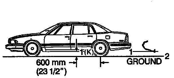 11. Measure the clearance (1) between the rear underbody and the ground (2). The clearance (1) should measure 236-256 mm (9 9/32-10 1/16 in) on the LSS, Eighty-Eight, Lesabre, and Bonneville.