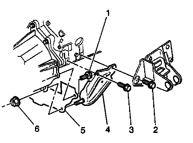 8. Remove the transmission brace nut (6) attaching the right brace (4) to the transmission.