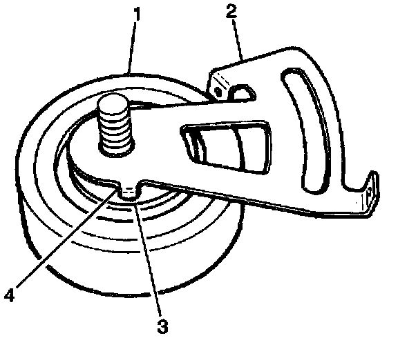 2. Insert the tensioner plate lug (4) into the timing belt tensioner hole (3).
