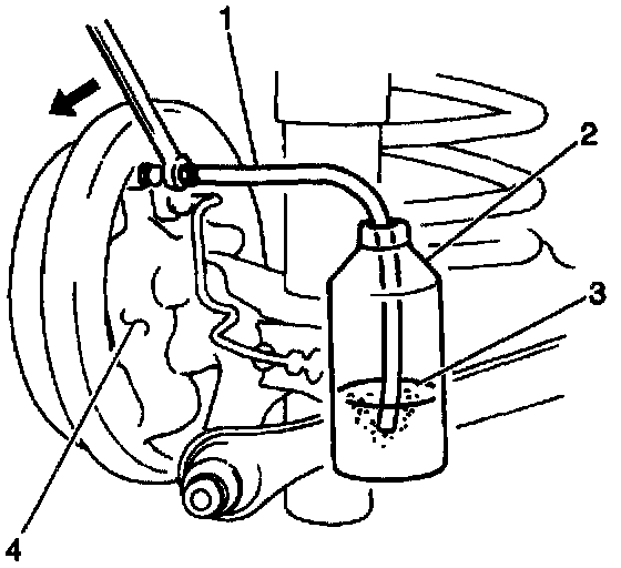 4. Attach a clear plastic or vinyl tube (1) to the bleeder plug. Submerge the other end of the tube in a clear container (2) that is partially filled with brake fluid.