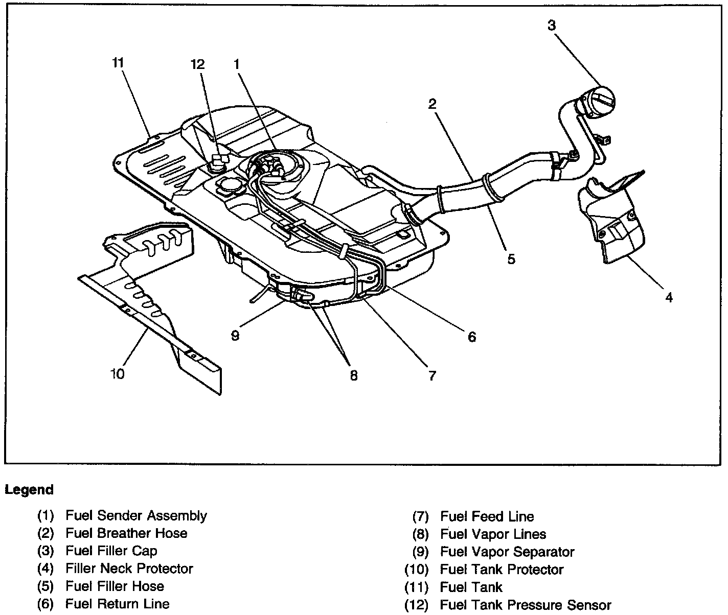 The fuel sender assembly is located in the fuel tank. The fuel sender assembly contains the electric fuel pump, the fuel level sensor (fuel gauge sender), and the fuel filter. The fuel sender assembly connects to the fuel lines with quick connect fillings. A fuel cut valve is located in the fuel sender assembly just below the fuel vapor pipe. The fuel cut valve consists of a float and a spring. The fuel cut valve allows only fuel vapors to enter the fuel vapor pipe. This prevents liquid fuel from leaving the fuel tank and flowing into the EVAP canister.