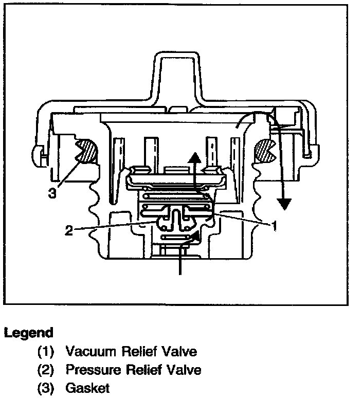 A vacuum relief valve is incorporated into the fuel filler cap. If the pressure in the fuel tank becomes negative (vacuum), the relief valve opens in order to relieve the pressure created within the fuel tank. Only when vacuum becomes excessive within the tank does this occur. Vacuum pressure is also vented through the tank pressure control valve which is located next to the EVAP canister.