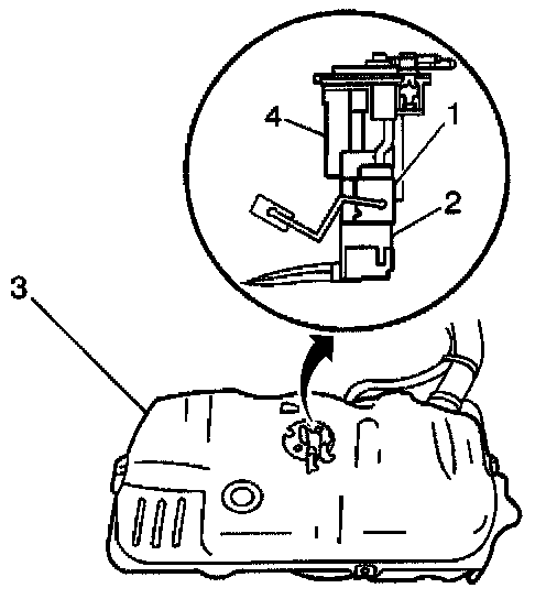 The fuel level sensor (1) is located in the fuel tank (3) and is an integral part of the fuel sender assembly (4). The fuel level sensor (fuel gauge sending unit) consists of a float, a float arm, and a variable resistor. The fuel level is measured by the position of the float in the fuel tank. The fuel level sensor indicates the position of the float to a gauge in the Instrument Panel (I/P) cluster assembly and the powertrain control module. When the fuel level changes, the float position changes. The change in the float position increases or decreases the resistance reading of the variable resistor. The change in the resistance causes a change in the indicated fuel level. The powertrain control module monitors the fuel level sensor and uses the signals from the sensor in order to determine when to perform certain EVAP control system diagnostics. Replace the fuel sender assembly in order to service the fuel level sensor.