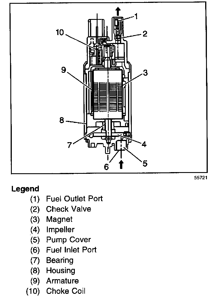The fuel pump is an electric pump that is controlled by the powertrain control module through the fuel pump relay. When the PCM commands the fuel pump to operate an impeller is driven by an electric motor in the pump assembly. The pump impeller causes the fuel in the tank to be drawn into the fuel pump inlet port. The fuel is then pumped out under pressure through the fuel feed pipe and hoses to the fuel rail and the fuel injectors. The fuel pressure is maintained when the fuel pump is not running by a pressure control valve located within the pump. Excess fuel is returned to the fuel tank by the fuel return pipe and hoses. The fuel pump is located in the fuel tank and is a part of the fuel sender assembly. The fuel sender assembly has to be disassembled in order to inspect or replace the fuel pump.