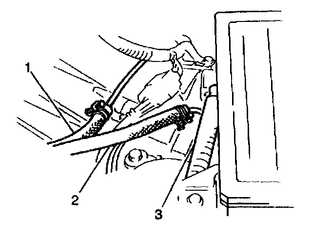 In a major transaxle failure where particles of metal or engine coolant has been carried with the fluid throughout the transaxle and its fluid cooling system, it will be necessary to flush out the fluid cooler and its connecting hoses. Use the following procedure in order to flush out the fluid cooler and the hoses:1. Disconnect both cooler hoses (11,2) at their clamps at the top of the transaxle.
