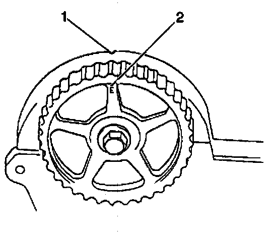 1. Ensure that the mark on the camshaft timing belt pulley (2) is aligned with the V mark on the inside of the timing belt cover (1). If not, align the two marks by turning the camshaft. Do not turn the camshaft more than its allowable turning range.